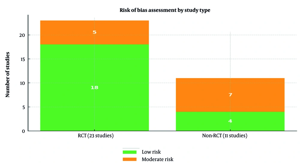 A quality assessment was conducted for the 34 included interventional studies. Among the 23 RCTs, 18 studies were rated as having a low risk of bias, and 5 as moderate risk. Among the 11 non-randomized studies, 4 were classified as low risk, and 7 as moderate risk. Overall, 22 studies (65%) were considered low risk, and 12 (35%) moderate risk; none were rated as high risk (Figure 2).