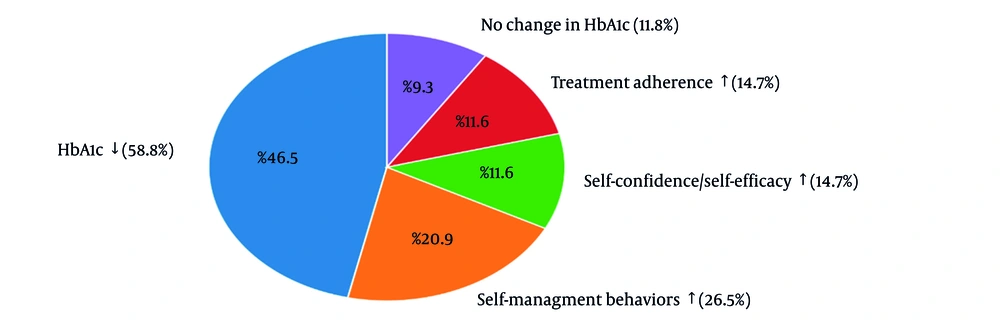As illustrated in Figure 6, the most frequently reported primary outcome was a significant reduction in HbA1c, observed in 58.8% of studies (13-17, 24, 21-23 , 26-30, 32-35). Improvements in self-management behaviors were reported in 26.5% (14, 16, 20, 24, 25, 27, 29, 31, 33), while increased self-confidence and self-efficacy, as well as enhanced treatment adherence, were each reported in 14.7% (14, 16, 20, 21, 25, 27, 29, 35). Additional primary outcomes included better hypoglycemia self-management, greater hypoglycemia awareness, improved time in range (TIR) and glycemic variability (GV), and reduced fear of hypoglycemia (FOH) (9). Nevertheless, 11.8% of studies reported no significant change in HbA1c (Figure 6) (15, 26, 35, 37).