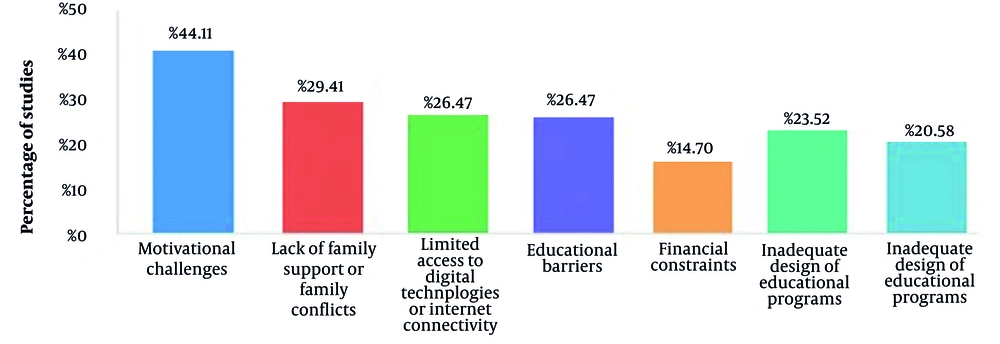 The most commonly reported barriers to effective self-management included motivational challenges, observed in 44.11% of the studies, such as (9-12, 15, 16, 20, 24, 25, 27, 29, 31, 33, 35, 36). Lack of family support or family conflicts was noted in 29.41% of the studies, including (10, 12, 16, 20, 24, 28, 29, 31, 33, 35). Limited access to digital technologies or internet connectivity was identified in 26.47% of the studies, such as (9, 11, 15, 23, 26, 27, 30, 35, 36). Educational barriers, including low knowledge or poor understanding of self-care, were mentioned in 26.47% of the studies, like (9, 10, 12, 14, 17, 24, 25, 27, 29). Financial constraints were found in 14.70% of the studies, including (13, 22, 25, 27, 30), and poor communication with the healthcare team was reported in 23.52% of the studies, such as (9-11, 14, 17, 24, 25, 31). Finally, inadequate design of educational programs was identified in 20.58% of the studies, including (Figure 5) (9, 12, 14, 25, 31, 35, 37).