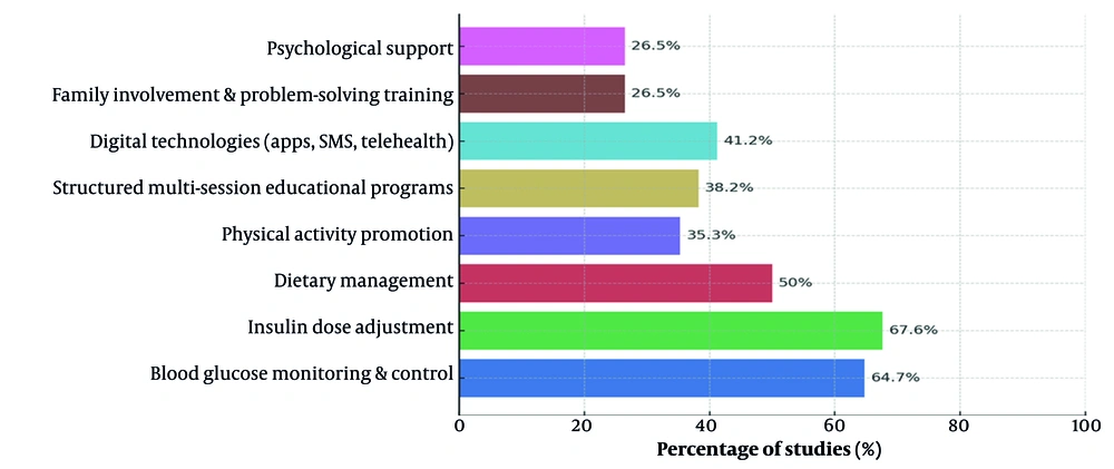 In the self-management interventions reviewed across 34 studies, the content of self-care education was highly diverse. As shown in Figure 3, the main components of self-management interventions and their frequency across studies are summarized. Some common components included blood glucose monitoring and control, which was reported in most studies (64.7% of studies) (9-24, 26, 28-32). Insulin dose adjustment was addressed in approximately 67.6% of studies (9, 11, 13-17, 22-29, 31-36, 38, 39). Dietary management was included in about 50% of studies (10, 13, 14, 16, 17, 24-35, 39). Physical activity promotion was applied in 35.3% of studies (12-14, 16, 24, 25, 27, 30, 31, 33, 35, 36). Additionally, structured multi-session educational programs, present in approximately 38.2% of studies, were implemented in (9, 12, 14, 16, 17, 24, 25, 27, 29, 31, 33, 36, 38). The use of digital technologies, including mobile apps, text messaging, and telehealth systems, was incorporated in 41.2% of studies (13, 15, 16, 23-27, 29-32, 36). Some studies also emphasized family involvement and problem-solving skill training. Psychological support was included in approximately 26.5% of interventions to improve self-efficacy and quality of life (Figure 3) (10- 12, 14, 17, 18, 20, 25, 27, 29).
