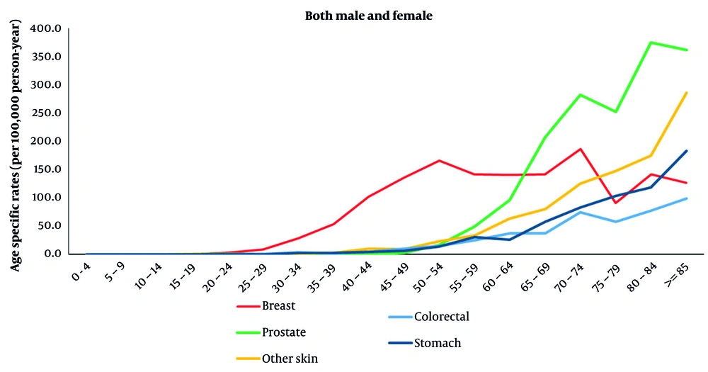 In general, the incidence of cancer and the related mortality are rapidly increasing globally as a result of aging, population growth, and changes in the incidence and frequency of major risk factors for cancer, some of which are associated with economic and social development (1). According to the World Health Organization, cancer has been the first or second leading cause of death before the age of 70 in 112 (out of 183) countries and the third or fourth leading cause in 23 other countries (2). According to World Health Organization statistics, although the incidence of cancer is generally 2 times higher in developed countries compared to developing countries, the resulting mortality rate is much higher in developing countries (2). In Iran, as a developing country, socioeconomic growth and changes in the traditional lifestyle have led to changes in the incidence of cancer and its related risk factors (3). In Iran, cancer is the third leading cause of death, after cardiovascular diseases and accidents, and its incidence has been increasing in recent years (4). The average standardized incidence rate for all cancers was 154.98 per 100,000 people, with significant differences observed between provinces and ethnic groups (5). Iran is recognized as a multi-ethnic country with different lifestyles across various regions. This diversity has resulted in varying cancer statistics throughout Iran (6). Studies have shown that the incidence of cancer varies in different regions (7, 8), which is probably attributable to environmental (9, 10), geographic (11-13), and ethnic (14, 15) risk factors rather than genetic differences. Due to the distinctive nature of cancer and the lack of a definitive treatment, this disease is considered one of the most important research priorities in all societies. In this regard, understanding the geographical incidence of various types of cancer is the first step in proper planning.