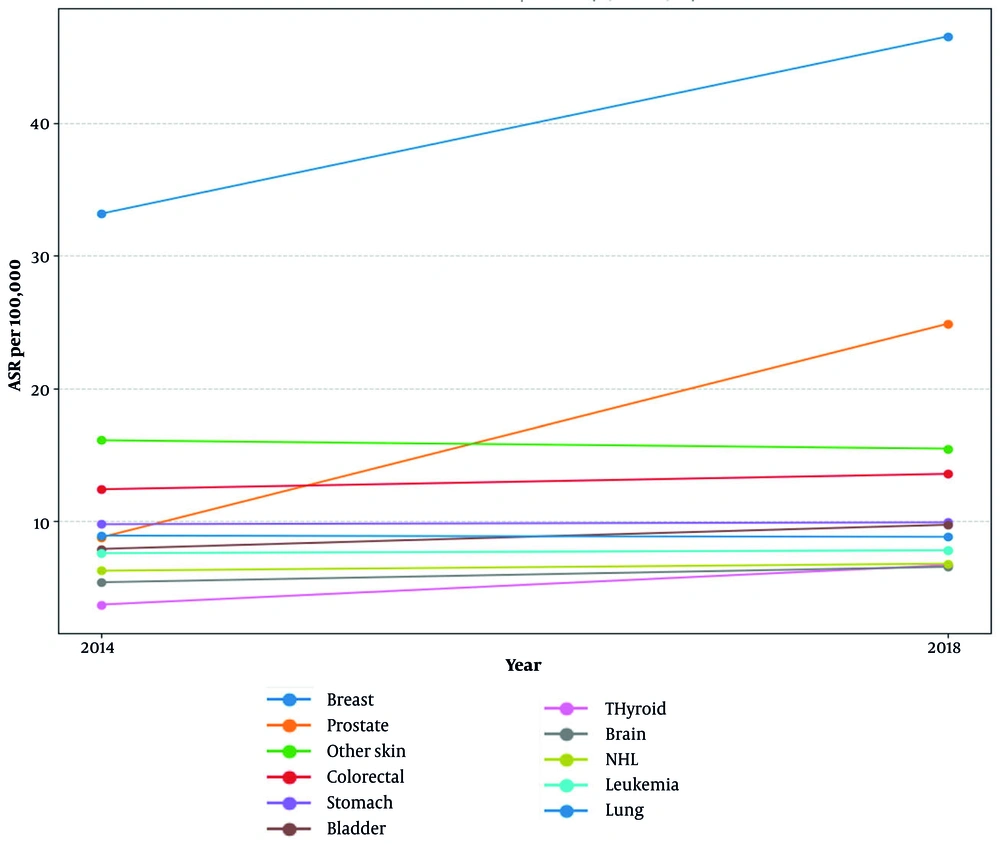 This registry-based serial cross-sectional time-trend study, utilizing data from the Khuzestan Cancer Registry at Jundishapur University of Medical Sciences, revealed a consistent increase in registered cancer cases from 2014 to 2018. A total of 29,289 cancer cases were recorded during this five-year period, with the overall ASR rising from 150.90 to 174.18 per 100,000 population — an increase of 13.37%. This upward trend is steeper than that observed in longer-term national studies; for example, Bidhendi-Yarandi and Panahi reported a smaller increase over a 12-year period (2003 - 2015) (19). In 2014, the most common cancers by ASR were breast, other skin (non-melanoma), colorectal, and stomach cancers. By 2018, prostate cancer had risen to the second most common cancer, following breast cancer, while other skin and colorectal cancers remained among the top four. The steepest increases were observed for prostate (APC = 29.5%), thyroid (APC = 15.8%), breast (APC = 8.8%), bladder, and brain cancers. In contrast, other skin and lung cancers showed slight declines. These patterns are consistent with national trends, including the rising burden of breast cancer among Iranian women — now exceeding global estimates (20) — and underscore the urgent need for early detection and cancer control policies.