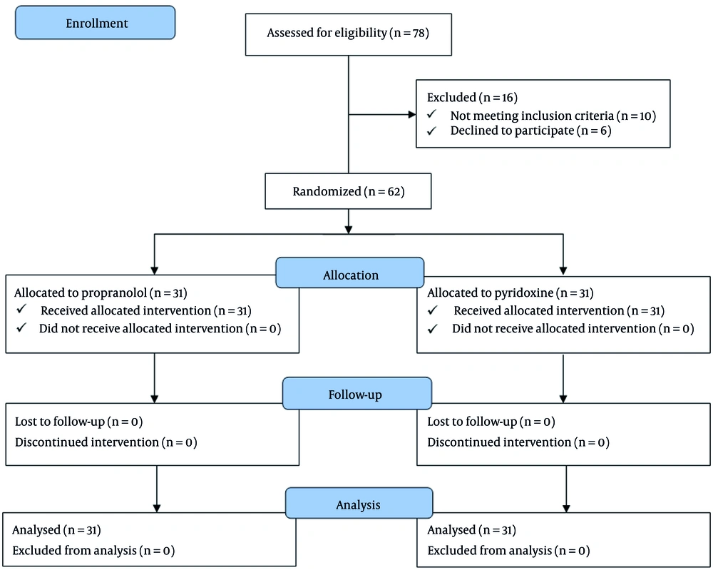 This prospective clinical trial was conducted at Amir Kabir Hospital in Arak, Iran. The study enrolled pediatric patients diagnosed with migraine headaches. The sample size was calculated to detect a clinically meaningful difference in headache duration and Ped MIDAS scores between the propranolol and pyridoxine groups. Assuming a two-sided significance level of α = 0.05, 80% power (β = 0.20), and a moderate effect size (Cohen’s d ≈ 0.7), the required sample size was 28 participants per group. To allow for potential dropouts, 31 participants were enrolled in each group. This sample size ensures adequate power to detect differences in the primary outcomes. A total of 62 pediatric participants were required for the study. However, 10 potential participants were excluded based on the exclusion criteria, and 6 declined to participate. Consequently, 78 cases were initially assessed, and 62 participants (31 in each treatment group) were ultimately enrolled and followed up in the study (Figure 1).