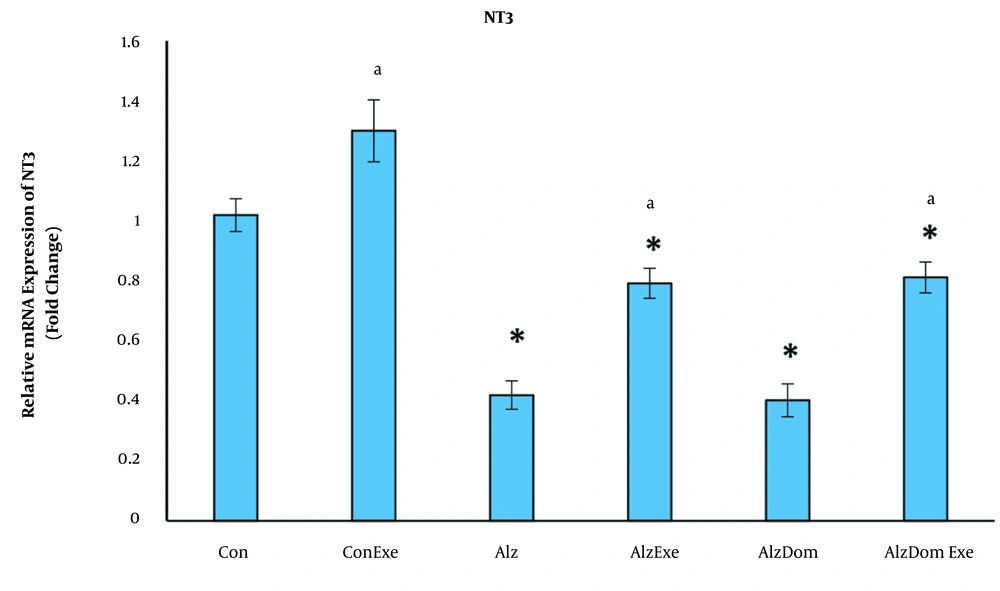 As Figure 7 shows, the level of mRNA expression of NT3 significantly decreased in all studied groups except Con-Exe compared to control group (P < 0.01 in all cases). The mRNA expression level of NT3 significantly increased in Con, Con-Exe, Alz-Exe and Alz-Don-Exe groups compared to Alz group (P < 0.05). This level was not significant in Alz-Don group compared to Alz group (P < 0.05). Also, this level was significantly higher in Alz-Don-Exe group compared to Alz-Don group (P < 0.05).