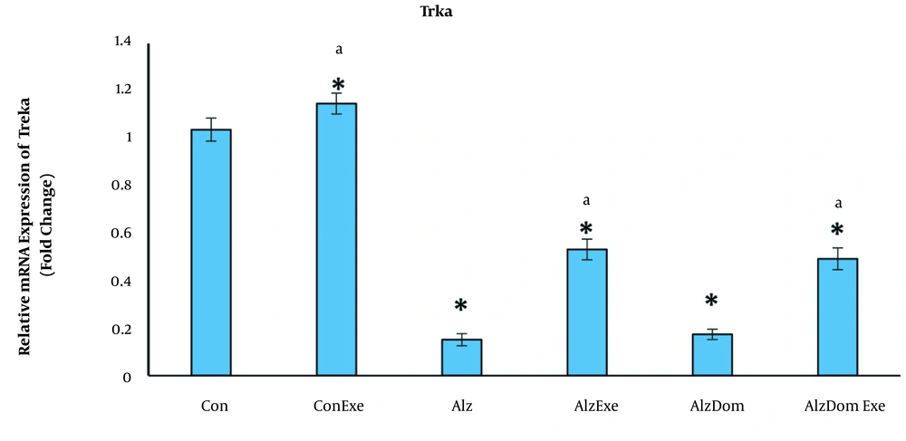 As Figure 5 shows, the level of mRNA expression of TrkA significantly decreased in all studied groups except Con-Exe group compared to control group (P < 0.01 in all cases). The mRNA expression levels of TrkA significantly increased in Con, ConExe, AlzExe and Alz-Don-Exe groups compared to Alz group (P < 0.05). This level was not significant in Alz-Don group compared to Alz group (P < 0.05). Also, this level in Alz-Don-Exc group was significantly higher than in Alz-Don group (P < 0.05).