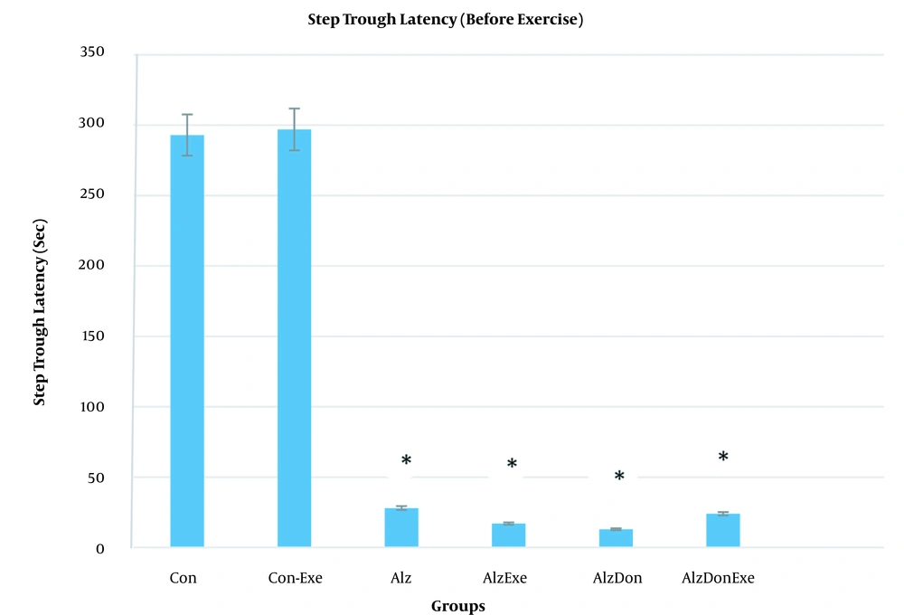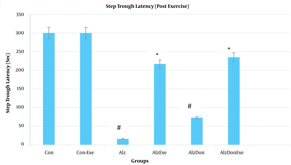 Regarding the effect of resistance training and donepezil consumption on learning, our results also showed that performing eight weeks of resistance training and concomitant use of donepezil significantly increased learning. These results are consistent with the results of Jiangbo and Liyun (19). Accordingly, it can be said that resistance training and donepezil use can increase learning by increasing neurogenesis, increasing the expression of neurotrophins and their receptors, increasing cerebral blood flow, reducing the activity of acetylcholinesterase, and reducing the neuronal apoptosis.