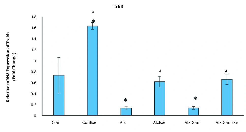 As Figure 6 shows, the level of mRNA expression of TrkB significantly decreased in all studied groups except Con-Exe compared to control group (P < 0.01 in all cases). The mRNA expression level of TrkB significantly increased in Con, Con-Exe, Alz-Exe and Alz-Don-Exe compared to Alz group (P < 0.05). This level was not significant in group Alz-Don compared to Alz group (P < 0.05). Also, this level in Alz-Don-Exe group was significantly higher than in Alz-Don group (P < 0.05).