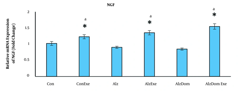As Figure 4 shows, the level of mRNA expression of NGF significantly increased in all studied groups except Alz and Alz-Don compared to the control group (P < 0.05 in all cases). The mRNA expression levels of NGF in Con, Con-Exe,Alz-Exe, and Alz-Don-Exe groups were higher than Alz group (P < 0.05). This level was not significant in Alz-Don group compared to Alz group (P < 0.05). Also, this level in Alz-Don-Exe group was significantly higher than Alz-Don group (P < 0.05).