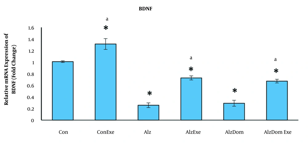 As Figure 3 shows, the level of mRNA expression of BDNF significantly decreased in all studied groups except Con-Exc compared to the control group (P < 0.01 in all cases). This level in Con-Exc was greater than the control group (P < 0.05). The expression level in BDNF mRNA significantly increased in Con, Con-Exc, Alz-Exc, and Alz-Don-Exc groups than in Alz group (P < 0.05). This level was not significant in group Alz-Don compared to Alz group (P < 0.05). This level in Alz-Don-Exc group was significantly higher than in Alz-Dom group (P < 0.05).