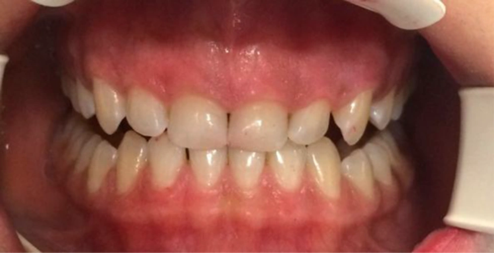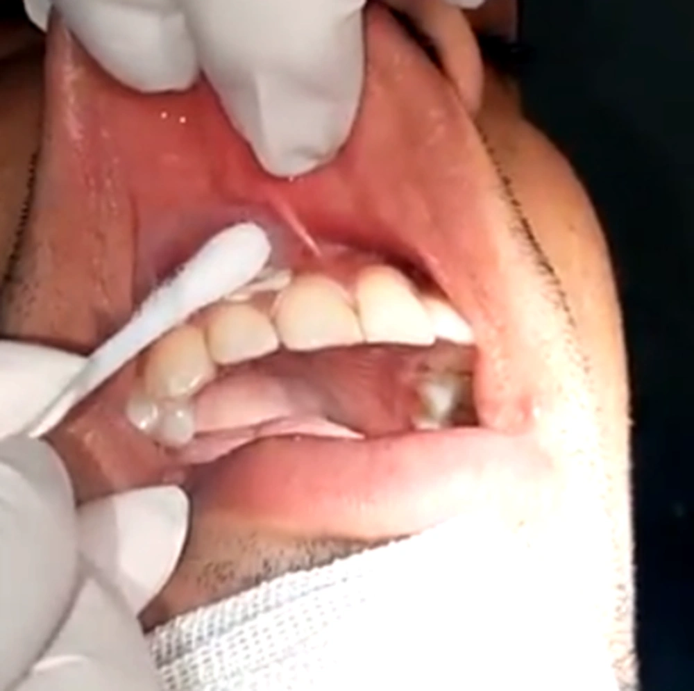 Cryosurgery technique: Treatment was started without local anesthesia and, if needed, local anesthesia was considered. The patients did not insist on local anesthesia. The maxillary labial surface was isolated by cotton rolls, and suction and cryosurgery was performed by a cotton swab. For this type of therapy, the cotton swab was soaked in liquid nitrogen and was placed on the diseased area. The swab was gently rotated back and forth for 10 to 15 seconds until the disappearance of pigmented areas and the emergence of snowy white facade in contact with the tissue. The snowy white facade appeared after approximately 20 seconds. This process was repeated 4 to 5 times for each area. Patients were recommended to use Gelofen capsule (400 mg) for managing their pain. All patients were regularly followed up, at 1 month, 3 months, and 6 months.
