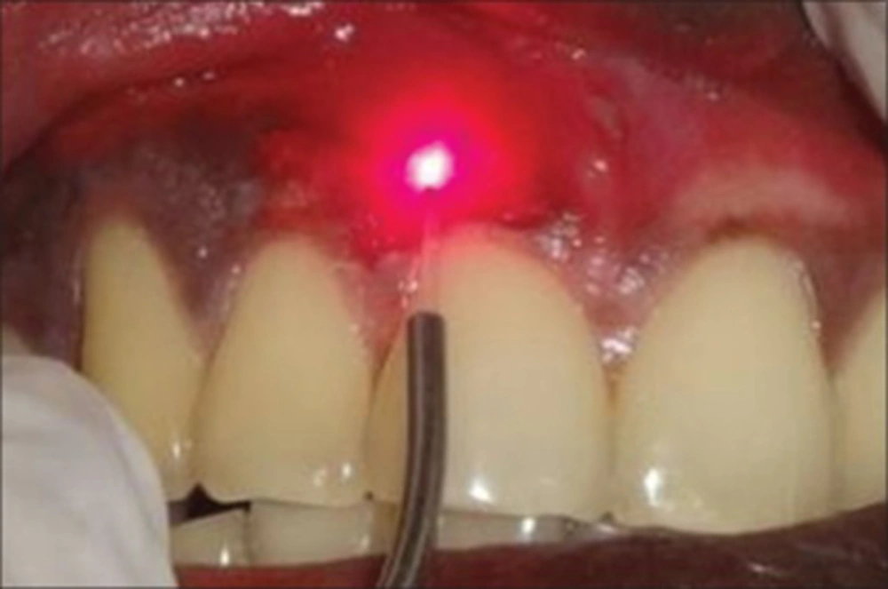 Laser technique: A diode laser device (CHEESE ™ type made by GIGGA laser CO, UK) with a wavelength of 810 nm was used. Laser therapy was started without local anesthesia and if needed, local anesthesia was considered. It should be noted that 10 patients expressed the need for anesthesia and local anesthesia was applied. The laser beam was irradiated in continuous and contact mode. Working time zone was considered based on the degree of melanin pigmentation and epithelial thickness of the area of treatment. The movement direction of the beam from mucogingival junction to gingival margin was free. To prevent gingival deformity, gingival margin and papilla remained intact.