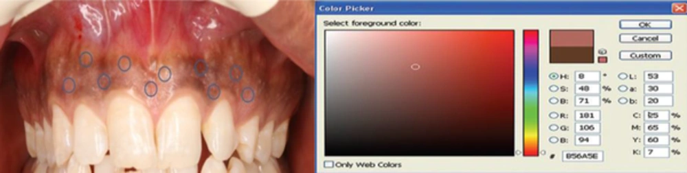 The degrees of gingival pigmentation before and after treatment were determined by the Photoshop CS4 software with colors of CMYK and RGB as follow: Mild (dark pink to pale brown), average (dark brown to black), and intense (various colors). An average color was considered for each area. Each patient was treated on one side by 810 nm diode laser with output power reaching 2 watts and the other side was treated by cryosurgery.