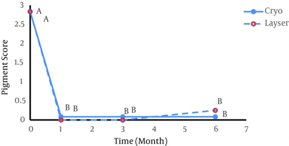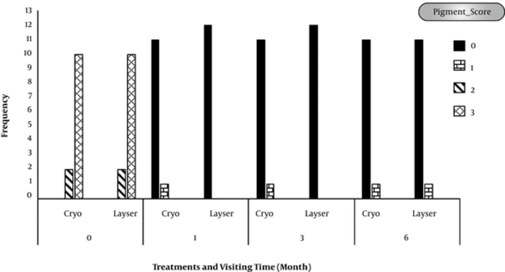 According to the findings of the present study, no significant difference was found between the 2 pigmentation removal methods. Farahmand et al., 2014, in their study conducted in Iran, investigating Er:YAG laser (Pd: 120 mj, RR:120 Hz) and cryosurgery methods, found no significant difference between the 2 methods and both were announced effective methods (28).