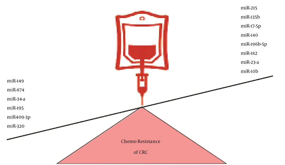 miR-23a and miR-196b-5p endorse the invasion, migration, and metastasis of CRC (46, 47). On the other hand, miR-195 and miR-10 have regulatory effects on the proliferation and migration of CRC cells (31, 48-50). Li et al. showed that miR-23a attenuated the 5-FU induced apoptosis and led to the chemoresistance of microsatellite instability CRC by targeting ABCF1 (51). Han et al. found that miR-874 led to apoptosis induction by 5-FU and chemosensitivity to 5-FU through the X-linked inhibitor of apoptosis protein (XIAP) targeting (31). Li et al. reported that the upregulation of mir-34a led to the chemosensitivity of CRC to 5-FU through LDHA targeting (32). Recent studies have indicated that expression levels of miR-10b and miR-196b-5p are correlated with poor prognosis in CRC patients. miR-10b enhances the 5-FU resistance of CRC cells by targeting BIM. miR-196b enhances 5-FU resistance and apoptosis induction by 5-FU by targeting SOCS3 and SOCS1 (4, 33). Qu et al. showed that a low expression level of miR-195 was associated with resistance to doxorubicin in CRC cells. Moreover, the overexpression of mir-195 promotes the chemosensitivity of CRC cells to doxorubicin and doxorubicin-induced apoptosis by targeting BCL2L2 (34).