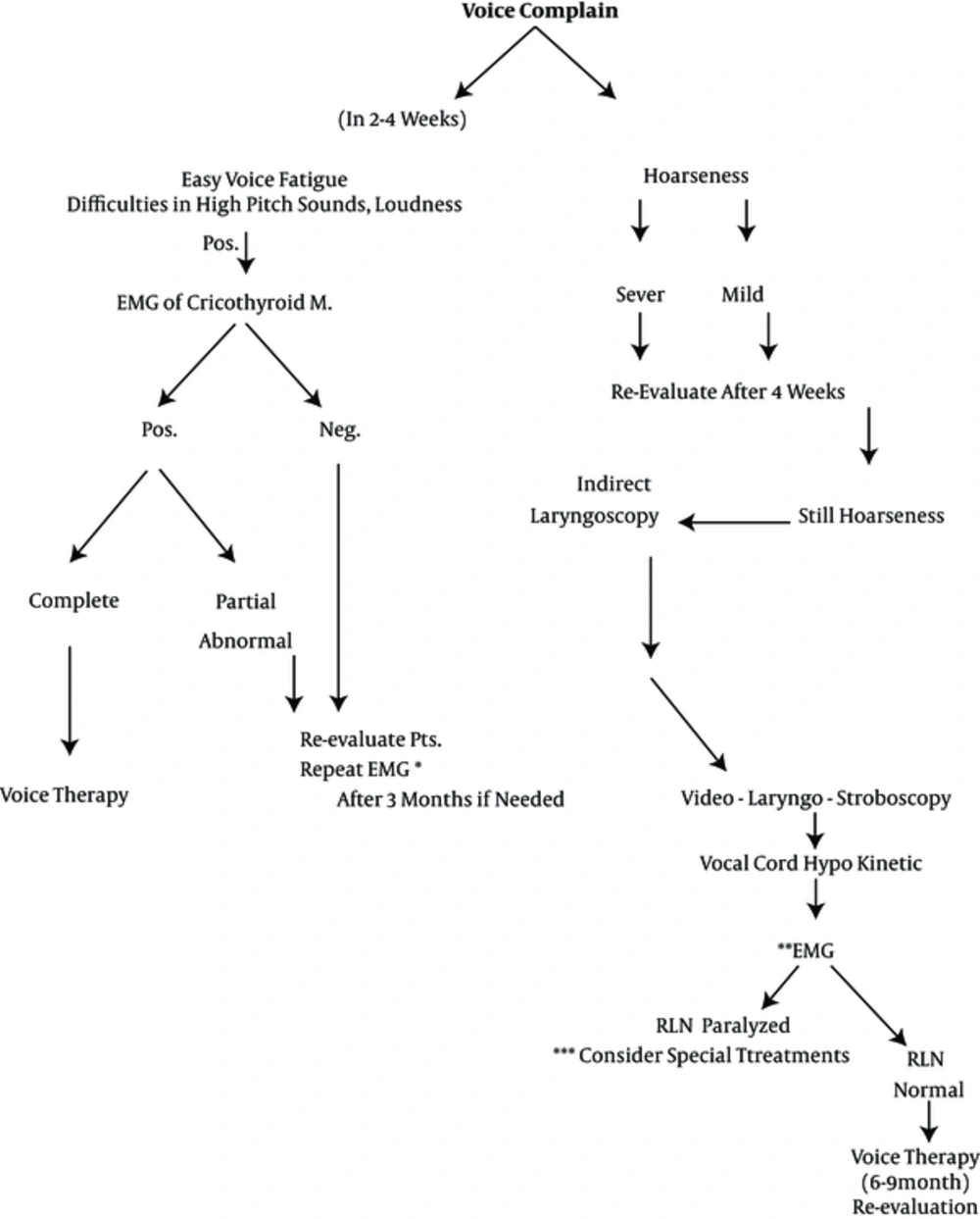 We did not attempt to classify nerves as Barczynski et al.’s classification (9) (Table 2). According to our results and other studies, we proposed an algorithm for approach to voice complaints and complications after surgical procedure on neck especially thyroidectomy (Figure 1).
