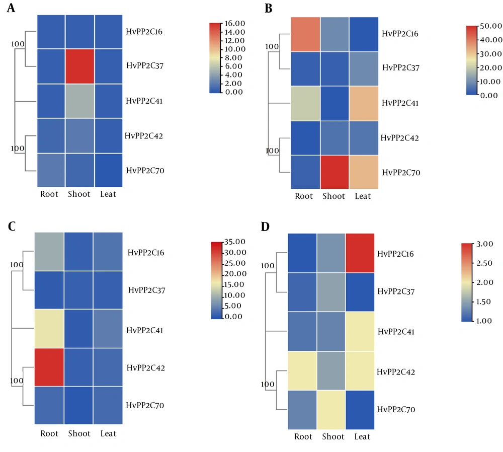 In Azaran and Jolge cultivars, the expression levels of five HvPP2C were determined under heat and cold stress conditions, most of which show a wide range of expression. To evaluate the expression profile of 5 PP2C genes and to evaluate the expression profile under heat and cold stress conditions, we utilized qRT-PCR analysis in different tissues: root, stem, and leaf. In the Azaran cultivar, HvPP2C37 and HvPP2C70 genes showed low expression in the root under cold stress conditions (Figure 5A), whereas HvPP2C16 and HvPP2C42 genes showed increased expression in the stem tissue (Figure 5A). In the leaf tissue, an increased expression of HvPP2C37, HvPP2C41, HvPP2C42, and HvPP2C70 genes was also shown (Figure 5A). Similarly, the expression levels of MtPP2C genes, such as MtPP2C37, were altered significantly during cold stress (9). In the Azaran cultivar, the HvPP2C gene showed decreased expression, except for the gene HvPP2C70, which showed increased expression in the stem tissue under cold stress (Figure 5A). Also, HvPP2C37 and HvPP2C41 genes were up-regulated in stem tissue under heat stress (Figure 5B). All HvPP2C genes showed reduced expression in leaves under heat stress (Figure 5B). Maximum expression was observed for the HvPP2C16 gene in the root compared with the other genes. It has been reported that among the BdPP2Cs studied, BdPP2C37 was increased under heat and cold stresses. Previous study has shown that BdPP2C70 strongly enhanced expression levels in response to abiotic stress, indicating that they may contribute in response to ABA (10). These results showed that the HvPP2C16 gene can be used as a molecular marker in barley improvement.