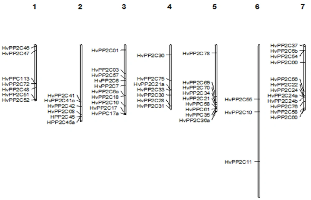 Afterward, the 61 HvPP2C genes were drawn using the MapChart software, and sixty-one HvPP2C genes were located across all seven chromosomes, ranging from 3 to 12 per chromosome (Figure 2). The number of HvPP2Cs on each chromosome varied, and chromosome 7 contained the largest number of HvPP2C members with 12 genes. However, the least number of genes was detected on chromosome 6, containing only three HvPP2C genes. In addition, seven HvPP2C were located on chromosomes 1 and 4. The 6 and 10 HvPP2C genes were located on chromosomes 2 and 3, respectively. Finally, nine HvPP2C were distributed on chromosome 5. Based on the research on rice, Arabidopsis, and B. distachyon, it has been shown that PP2C gene families mainly expanded through whole-genome and chromosomal segment duplications (9, 15). As shown in Fig 2, these 19 pairs of duplicated HvPP2C genes are distributed on chromosomes 1, 2, 3, 5, 6, and 7 but not on chromosome 4 (Figure 2).