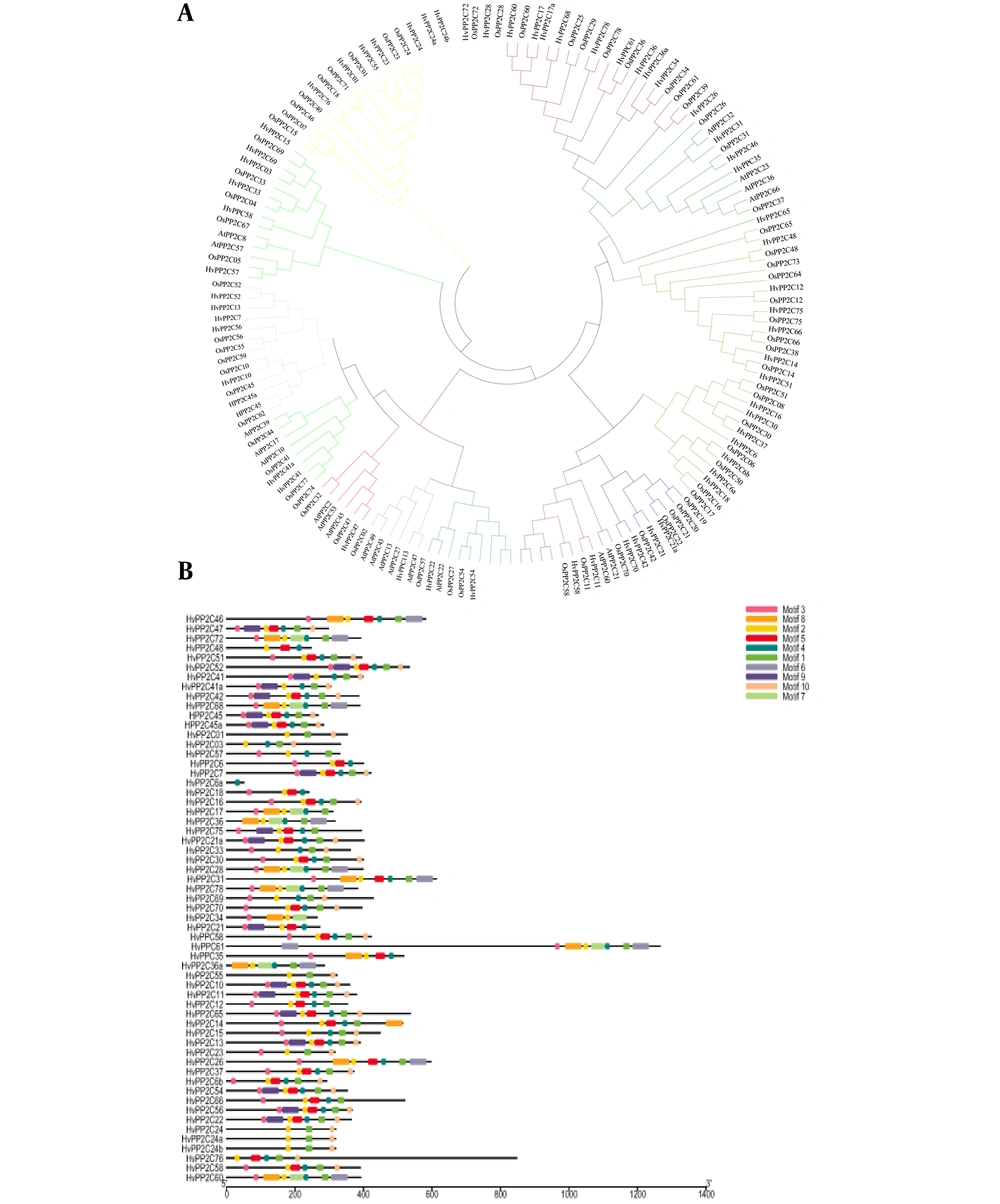To assess the phylogenetic relationships of the 61 HvPP2C proteins in barley, we performed a phylogenetic analysis using MEGA7 software (Figure 1). The phylogenetic tree showed that the PP2C genes can be divided into 12 subgroups. Previous studies showed that MtPP2C genes in Arabidopsis and rice were divided into 13 subfamilies (9, 11, 12). Some researchers have revealed that HvPP2C genes from monocots can be grouped into 13 subfamilies based on their domains (9, 13). The results show that the exact function of the genes of the subfamilies is due to the conserved motifs.