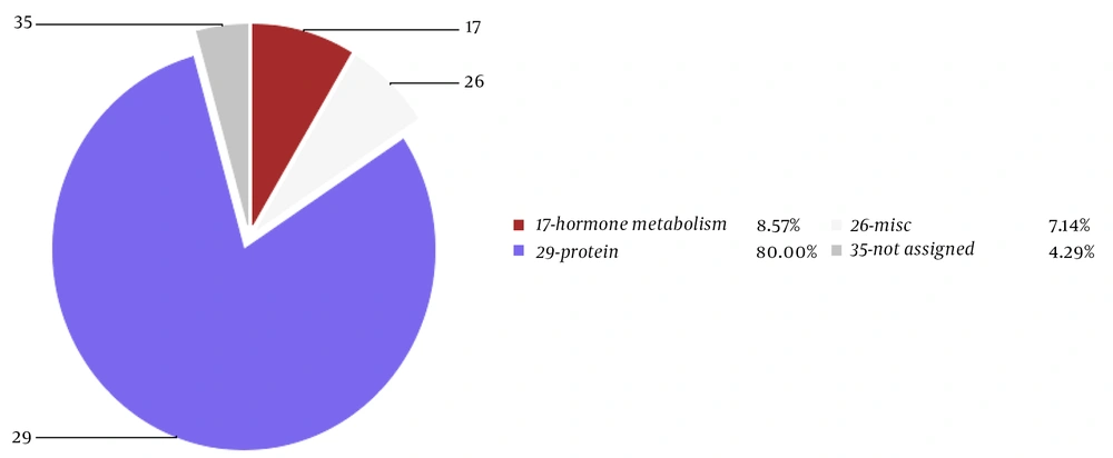 In barley, the largest percentage of detected proteins was implicated in protein metabolism (80%), and the second largest class was involved in hormone metabolism (8.57 %) (Figure 4). The percentage of mitochondrial 2-oxoglutarate/malate carrier protein (misc) was 7.14%. Most of the HvPP2C genes in the barley were involved in protein metabolism (protein degradation, post-translational modification, and protein synthesis) and hormone metabolism. Different kinds of HvPP2Cs were involved in protein degradation-related proteins, implying that the PP2Cs might play major roles in protein degradation during the barley seedling stage. Our findings showed that HvPP2C genes play a key role in abiotic stresses like cold and heat stresses. The HvPP2C had TFBs responsive to hormonal stress, indicating its role in response to abiotic stresses.