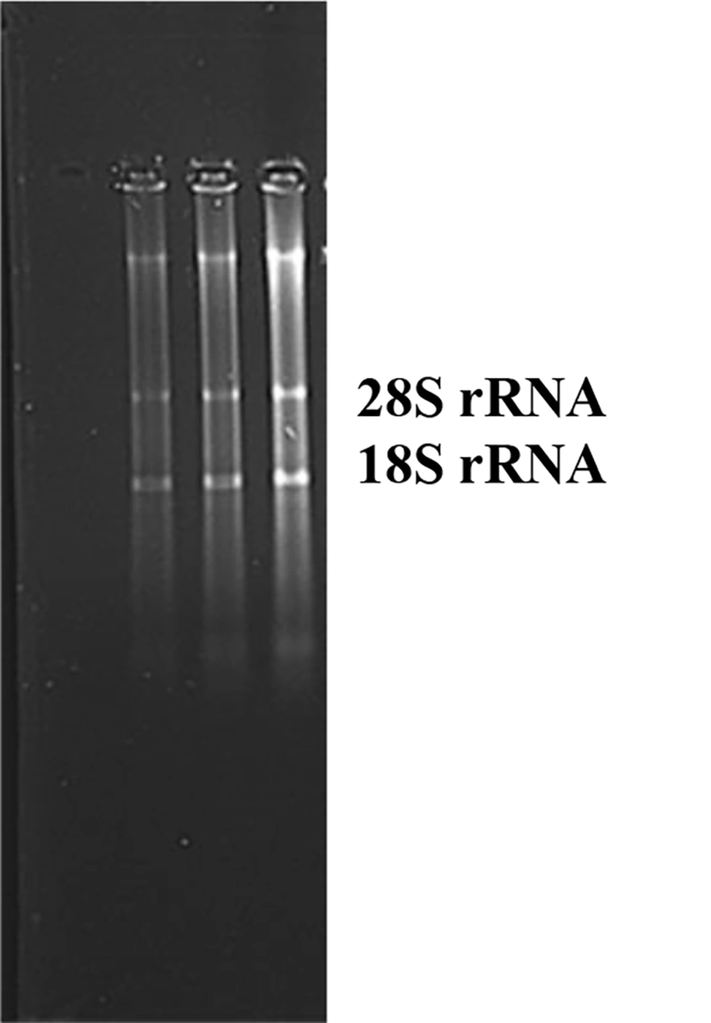 The observation of ribosomal RNA bands on a 2% agarose gel suggests that the RNA remained undamaged during extraction (Figure 1). The intact RNAs had acceptable 260:280 and 260:230 absorption ratios ranging from 1.8 to 2.2 (data not shown). Samples lacking ribosomal RNA or with unacceptable absorption ratios were excluded from the study.