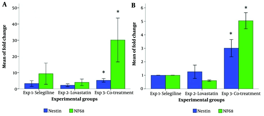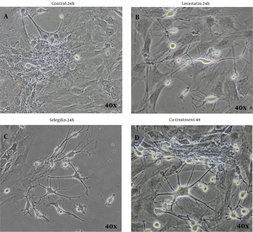 Studies have shown that selegiline, as an irreversible inhibitor of monoamine oxidase, is effective in differentiating stem cells into neuron-like cells by changing the expression of certain genes and proteins in the cell (7). Selegiline, a monoamine oxidase (MAO) inhibitor, was developed by Zoltan, the Hungarian pharmaceutical company Chinoin. In 1989, the US Food and Drug Administration (FDA) approved selegiline for the treatment of Parkinson’s disease. Later, in 2006, the FDA also approved the transdermal form of the drug (8). Selegiline has been shown to increase the expression of nerve growth factor and glial-derived neurotrophic factor in the nigrostriatal and mesolimbic dopamine signaling pathways (9, 10). In addition, selegiline may have neuroprotective effects and may slow the progression of Parkinson’s disease by promoting the production of neurotrophins such as brain-derived neurotrophic factor, nerve growth factor, and glial cell neurotrophic factor. These neurotrophins play an important role in protecting neurons from the inflammatory process. The induction and activation of multiple stress antioxidants and anti-apoptotic factors by selegiline may contribute to the maintenance of healthy brain tissue (11). As a neuroprotective drug, it can induce bone marrow stromal cells and differentiate them into neuron-like and glial cells in vitro (12). In addition, statins, such as lovastatin, are potent cholesterol-lowering agents used clinically in cardiovascular events associated with atherosclerosis (13). In addition, its safety has been confirmed in vivo and in vitro. Statins have pleiotropic effects, including antioxidant, immunomodulatory, and neuroprotective properties (14-16). Interestingly, previous data have shown that statins can alter the expression of neurotrophic factors in various animal models of neurological disorders (17).