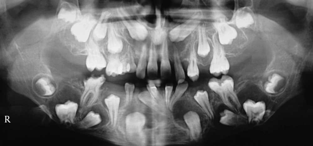 Multiple calcifying hyperplastic dental follicles (MCHDF) are among the exceedingly rare situations initially described by Gomez et al. Sandler et al. as odontogenic fibroma-like changes of dental follicles (1, 2). Many authors have suggested that this condition could be considered a pathologic entity (3, 4). To date, 11 cases have been published in the English literature (3, 5). The aim of the present article is to report an additional example of this entity.