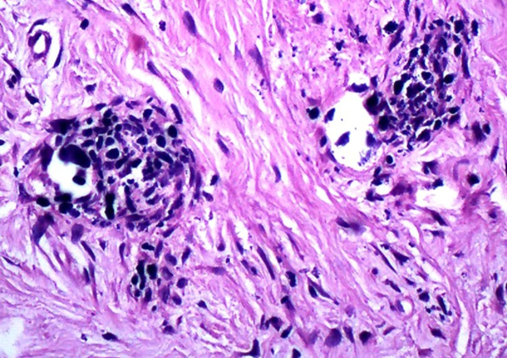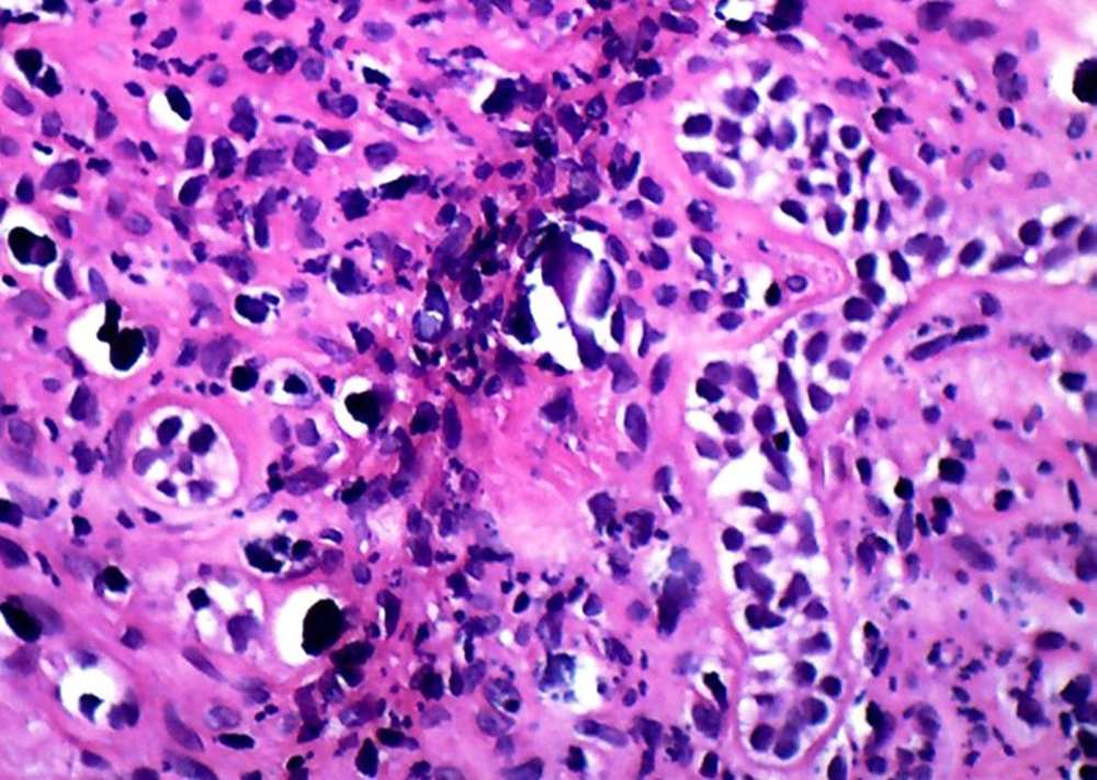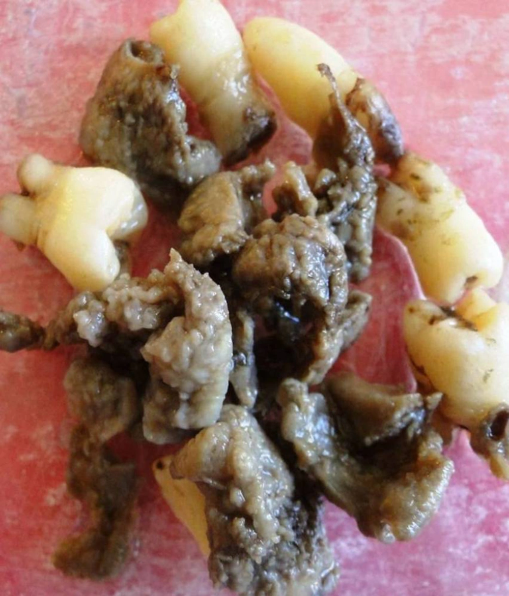 A 13-year-old boy with the chief complaint of multiple unerupted teeth was referred to department of Oral and Maxillofacial Surgery of Ahvaz University of Medical Sciences in May 2013. The panoramic radiograph revealed 15 unerupted teeth (8 in mandible and 7 in maxilla) with large pericoronal radiolucent zone (enlarged follicles) delineated by a well-defined sclerotic borders (Figure 1). Tooth abnormalities such as amelogenesis imperfecta were not seen. Medical and familial history was unremarkable and his siblings had normal dentition. The patient had normal intelligence. He did not have other signs and symptoms like cleidocranial dysplasia, Gardner syndrome, or mucopolysaccharidosis (three syndromes with tendency to multiple impactions). The incisional biopsy was performed with provisional diagnosis of Gorlin syndrome (multiple keratocystic odontogenic tumors). Microscopic examination revealed a dense and cellular fibrous connective tissue with numerous deposits of calcifications. Collagen fibers were arranged in whorled structures. Cords and islands of odontogenic epithelium with numerous clear cells were surrounded by these deposits. Calcifications were found in the whorled areas. There were many small circular droplets of basophilic calcified material resembling cementum. Most of the droplets were homogenous (up to 95%), but some revealed concentric layering similar to Liesegang rings of Pindborg tumor. The diagnosis was atypical follicles with odontogenic fibroma-like changes (WHO type) or hyperplastic calcified dental follicles (Figures 2- 4). Then, the excisional biopsy was performed for mandibular lesions. Grossly, the specimen consisted of multiple pieces of creamy brown soft tissues surrounding the crown of multiple extracted teeth totally measuring 5 × 5 × 1 cm. The lesions showed fine surface nodularities and produced a distinct grating sound during sectioning (Figure 5). The initial diagnosis has been confirmed. Additional surgical procedure must be performed for maxillary lesion in future.