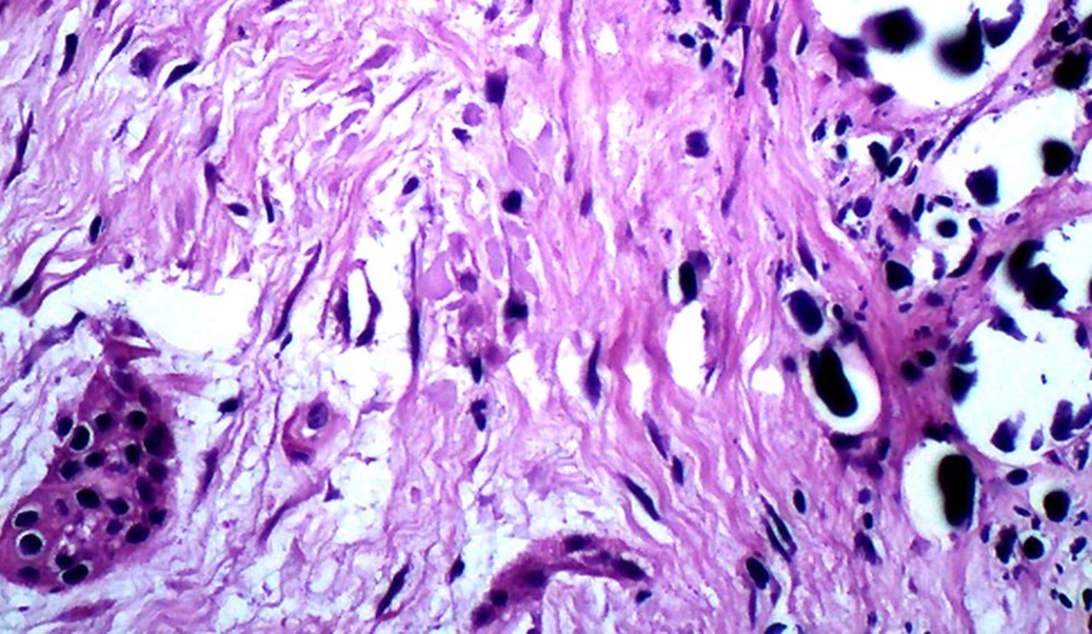 Cystic and tumoral changes may occur in dental follicles of impacted teeth, which makes the microscopic evaluation of enlarged follicles an important issue (3). One of the exceedingly rare conditions seen in dental follicles is MCHDF (1, 2). All of the reported cases in the English literature have occurred in males, with higher tendency towards the mandible (3, 5). Our patient similar to previous cases was male and both jaws were affected. Because of its almost exclusive occurrence in males, a hormonal influence seems probable. Microscopically, MCHDF resembled central odontogenic fibroma (WHO type). Both lesions have fibrous stroma, odontogenic epithelial islands, and calcifications. Odontogenic fibroma (WHO type) is a highly cellular intermixed with loose and vascular areas with cementum-like or dentinoid material (3, 4). Gardner et al. (4) have described MCHDF calcifications as type A (calcification arranged in whorled structure) and type B (calcification with peripheral tufts within fibrous stroma), whereas only type A calcification was observed by Sandler et al. and Lukinmaa et al. (2, 6). In addition, according to Cho et al. (5), calcified materials in MCHDF are categorized as acellular (Type I) and cellular, mostly resembling woven bone (Type II). In our case, most calcification was type A and there was no evidence of woven bone in all microscopic sections. The mineralized pericoronal tissue is probably related to the inclusion of odontogenic tissue (1). Many authors used picrosirius red stains with polarized light to make a distinction between central odontogenic fibroma and hyperplastic dental follicles. The greenish to yellow polarizing fibers of central odontogenic fibroma suggests that the collagen in central odontogenic fibroma is loosely packed and might be composed of procollagens, intermediates, or other pathologic collagens rather than the tightly packed fibers seen in hyperplastic dental follicles (7, 8). Reduced enamel epithelium (REE) that lined the fibrous wall of normal dental follicle did not exist in MCHDF. Moreover differentiation of central odontogenic fibroma from Pindborg tumor (calcifying epithelial odontogenic tumor) and hyperplastic dental follicles may be hard. However, the former typically shows evidence of amyloid material and the distinction between hyperplastic dental follicles and central odontogenic fibroma is based primarily on their clinical and radiologic manifestation (9, 10). Calcifications associated with odontogenic epithelial cells can also be found in many instances like opercula of third molars, in follicles associated with unerupted third molars and in amelogenesis imperfecta with multiple impactions (9, 11, 12). Raubenheimer et al. (7) also reported multiple odontogenic fibroma-like tumors developed in place of teeth. MCHDF is histologically identical to the hyperplastic dental follicles of regional odontodysplasia, but tooth abnormality that is seen in regional odontodysplasia (ghost teeth) was not found in our case (1, 13). Another entity described by Dominguez et al. (14) was fibro-odontogenic dysplasia that exhibited microscopic resemblance to MCHDF, but the former demonstrates osseous development and a familial characteristic. Several syndromes like cleidocranial dysplasia, Gardner, and mucopolysaccharidosis (Hunter syndrome) have multiple impact on teeth; however, there is no relationship between MCHDF and these disorders (4, 15). Additionally cysts in patients with Gorlin (Nevoid basal cell carcinoma) syndrome are often associated with the crowns of unerupted teeth that radiographically they may mimic dentigerous cysts, but this syndrome characterized by multiple keratocystic odontogenic tumors of the jaws (15). As a final point, etiology of MCHDF and the biological mechanisms of its development are not understood. Thus, we suggest genetic evaluation and endocrinopathy assessment for these patients to find the cause of this uncommon disorder in the near future. The knowledge about this rare entity and various microscopic patterns of dental follicles are essential and help to have a proper diagnosis and better treatment.