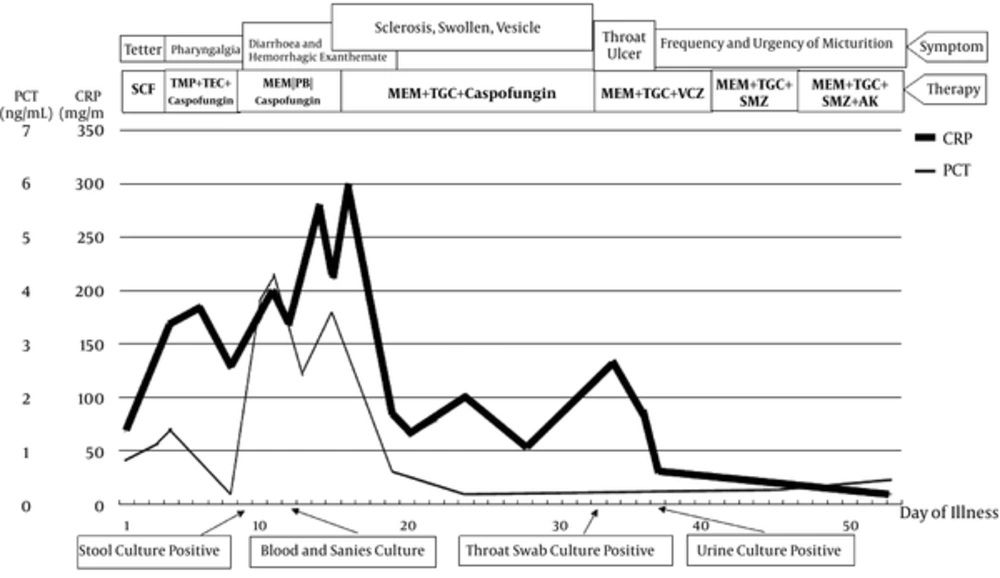 She received a 224 mL stem cell transfusion, including a mononuclear cell (4.87 × 108/kg), CD34+ (0.6%), as well as reached the transplantation threshold of CD34+ cell (3 × 106/kg). Nine days after transplantation, there were no severe side effects except a little bit of vomit. However, diarrhea and hemorrhagic exanthemate of both knees appeared April 15, 2016 and a 3 cm × 2 cm sclerosis appeared on the right greater lip of pudendum. The right greater and lesser lip of pudendum were swollen 1 day later on April 16, 2016. The inspection results, clinical symptoms, and prescriptions were collected (Figure 1). The isolates were collected from the stool culture on April 15, 2016, the blood culture as well as sanies culture on April 18, 2016, the throat swab culture on May 9, 2016, and the urine culture on May 13, 2016 were all the same bacterium (K. pneumoniae).