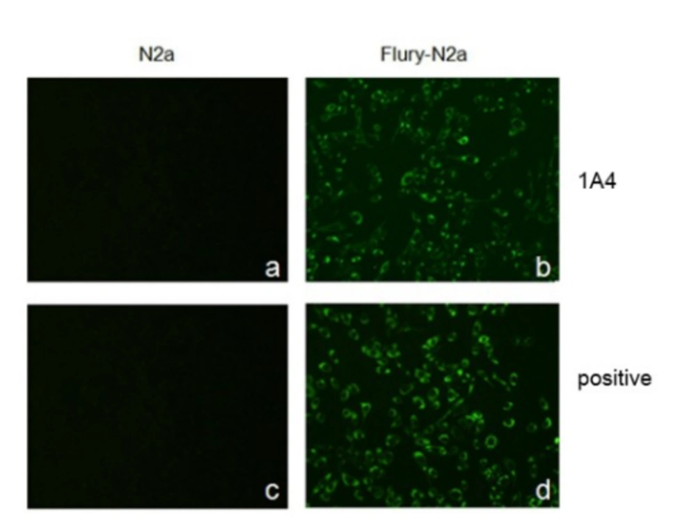 The activity and specificity of the obtained monoclonal antibody was determined with western blot and indirect immunofluorescence assay. The result of western blot showed a single band in the expected position, indicating that viral protein could be recognized by the 1A4 monoclonal antibody. The lysates of mock-infected N2a cells was also incubated with the same ascites monoclonal antibody and no band was observed (Figure 4). Furthermore, immunofluorescence assay showed that RABV-infected N2a cell could be notably recognized by the 1A4 monoclonal antibody and positive serum sample, compared to that in mock-infected N2a cells (Figure 5).