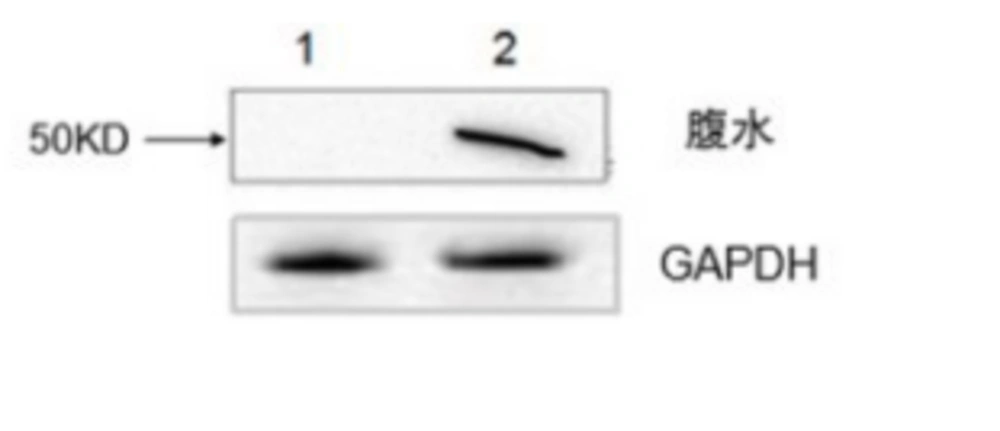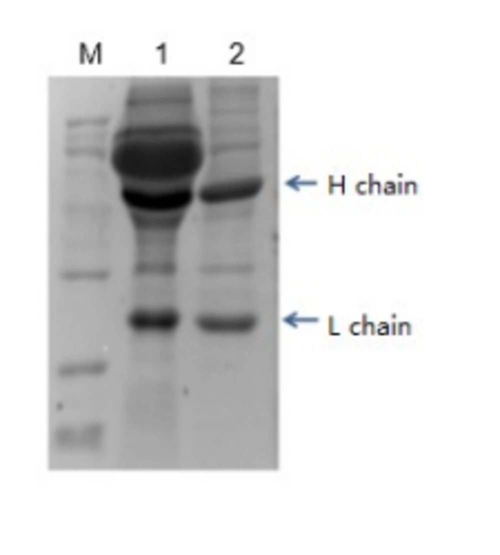 Through cell fusion and three sub-cloning steps, one hybridoma cell line with stable secretion of specific monoclonal antibody against RABV-P, named 1A4, was obtained. After the injection of Balb/c with 1A4, according to standard protocols, ascites were collected and centrifuged at 10,000 × g for 20 minutes at 4°C, and purification of ascites by ammonium sulfate method was performed. The purification results were verified by SDS-PAGE (Figure 3). The ascites antibody titer was examined by ELISA with different consecutive dilutions, 1:2000; 1:4000; 1:8000; 1:16,000; 1:32,000; 1:64,000; 1:128,000; and 1:256,000. The antibody titer was defined as the highest dilution of serum at which the A450 of ascites/A450 of negative serum was greater than 2.1. The antibody titer was approximately 1:256 000 (Table 1).