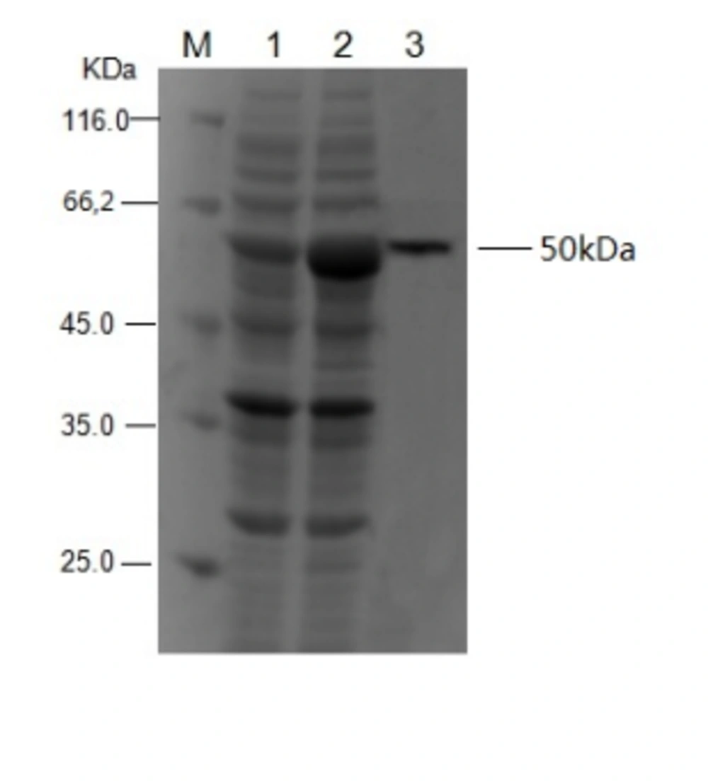 The confirmed pET-32a (+)-RABV-P plasmid was used to express the fusion protein in the expression host E. coli Rosetta (DE3). A band of approximately 50 kDa, the target protein size of the pET-32a (+)-RABV-P fusion protein, was observed. Thus, the recombinant RABV-P was successfully expressed in the E. coli. As the recombinant protein was expressed mainly in inclusion bodies, 8 M urea as a strong denaturant and Ni2+-affinity chromatography for purification of the recombinant protein were together added to the buffer. After binding to the resin, the target protein was successfully eluted with 250 mM imidazole elution buffer. The collected sample was analyzed by SDS-PAGE, and a single homogeneous band of about 50 kDa was observed (Figure 2). The purity of fusion protein was more than 90% and approximately 0.5 mg/mL of recombinant RABV-P was obtained.