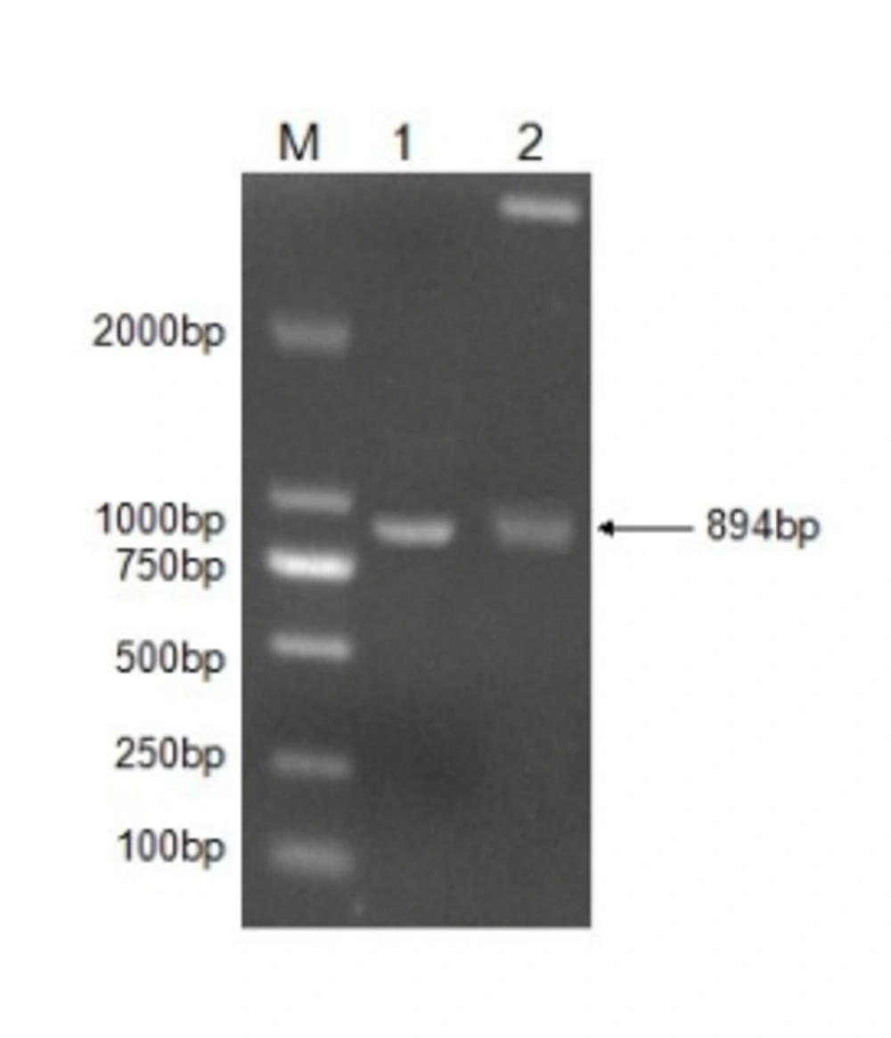 A 894-bp gene fragment was amplified by RT-PCR from rabies virus infected cells. The RABV-P gene was successfully inserted to expression vector PET-32a (+) (Figure 1). Sequence analysis of the inserted phosphoprotein gene (894 bp) displayed 100% identity with the sequence published in NCBI (GenBank: AF369264.1) (data not shown); no mutation was found in the nucleotide sequence of the inserted fragment.