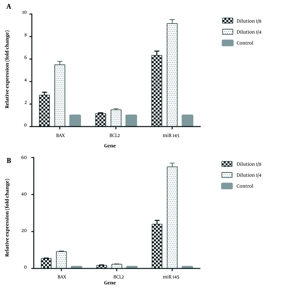 When B. clausii supernatant was added to HeLa cells for 24 h at a concentration of 1/8, the levels of BAX, BCL-2, and miR-145 genes increased to 2.8, 1.16, and 6.3 folds, respectively, compared with untreated cells. In addition, 1/4 dilution of the bacterial supernatant during 48 h increased BAX, BCL-2, and miR-145 genes by 5.5, 1.5, and 9.1 folds (Figure 3). A concentration of 1/8 B. clausii supernatant during 48 h could elevate the level of BAX, BCL-2, and miR-145 genes by 5.4, 1.7, and 24 folds, respectively, compared to the untreated condition.