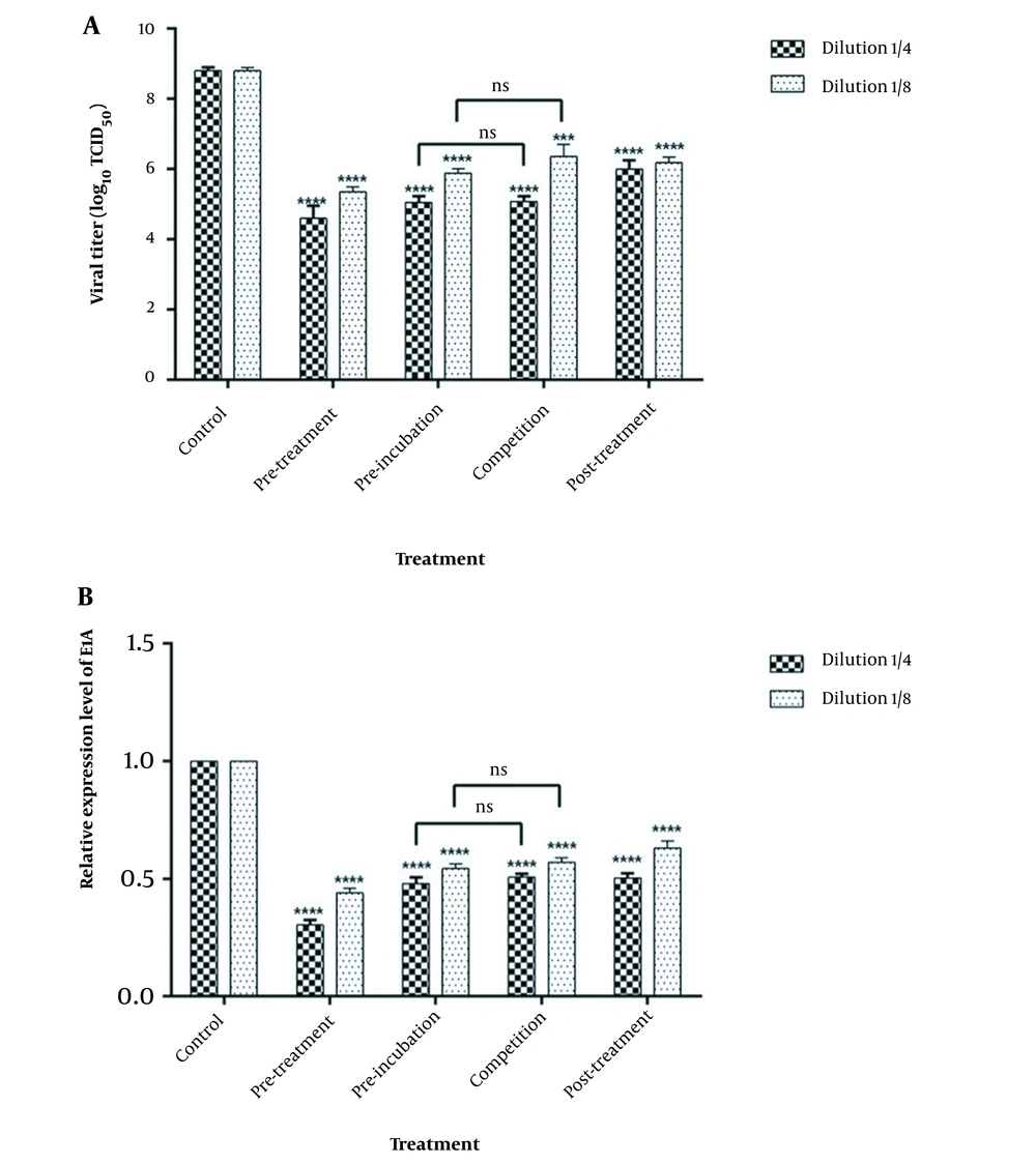 The human Ad5 titer was 8.91 ± 0.14 Log10 TCID50/mL when B. clausii supernatant was absent (control). The Ad5 titer was calculated after incubation of CFS (dilution: 1/4 and 1/8) and HEK-293 cells in different conditions. Data are summarized in Table 3 and Figure 2. The Ad5 titer in pre-treatment, pre-incubation, competition, and post-treatment conditions with a concentration of 1/4 supernatant dropped by 4.61, 4, 3.9, and 3.1 Log10 TCID50/mL, respectively. As demonstrated in Figure 2, the Ad5 titer was significantly lower (P-value 0.05) in all experiments than in the control group. The mean Ad5 titer in the pre-incubation and competition tests was similar. Similar results of the viral titration were shown when the E1A expression in the experimental and control tests was compared (Figure 2B). The most significant reduction in E1A-adenovirus expression was seen in the pre-treatment assay.