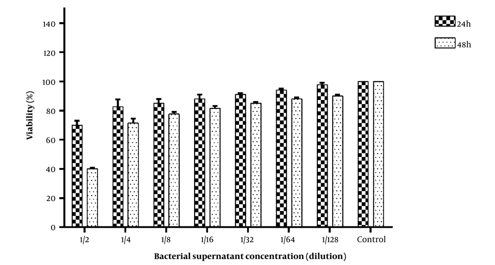 The results of HeLa cell viability are shown in Figure 1. The MTT findings revealed that incubating HeLa cells for 24 and 48 hours with bacterial supernatant at a concentration of 1/2 reduced viable cells proportion to 65% and 40%, respectively. Additionally, 80% of cells were still alive after exposure to CFS at concentrations above 1/4 for 24 h and above 1/8 for 48 h.