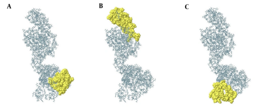 Identification of continuous B-cell epitopes could be useful in epitope-based vaccine design and antibody production. The prediction of the most probable B-cell epitopes in 3M2e-HA2-HSP70c was performed using ABCpred server by setting the cut-off value at > 0.8 and the length of the peptides was fixed as 20-mer. The top scoring peptides were selected as the appropriate epitopes (Table 1) and the location of these predicted epitopes was shown as space-filling model on the surface of the protein (Figure 1D). ElliPro is a powerful web server for the prediction of conformational B-cell epitopes using a three-dimensional structure. The number of residues involved in B-cell epitopes and their scores is given in Table 2. The position of predicted epitopes is demonstrated on the surface protein in Figure 2 (A through C).