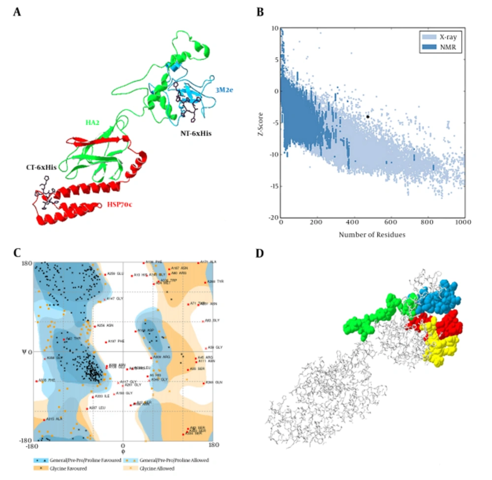 A, predicted model of chimer protein shown as line ribbon. NT-His and CT-His are shown as stick models with carbon atoms in black color; B, The Z-score plot of the best model; C, Ramachandran plot of tertiary model predicted by RAMPAGE; D, B-cell predicted epitopes using ABCpred: 18 - 37, 39 - 58, 153 - 172, and 172 - 191 are shown in yellow, red, green, and blue colors, respectively, as space-filling model.