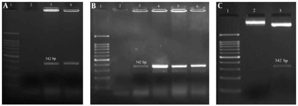 A, PCR result of HSP70 fragment amplification on 1.5% agarose gel: lane 1: 100 bp DNA ladder, lane 2: negative control, lane 3 - 4: PCR amplification of target gene; B, colony PCR results, lane1: 100 bp DNA ladder, lane 2: negative control, lane 3 - 6: confirmed colony; C, restriction enzyme analysis of chimer construct, Lane1: 100 bp DNA ladder, lane 2: un cutting construct, lane 3: cutting construct.