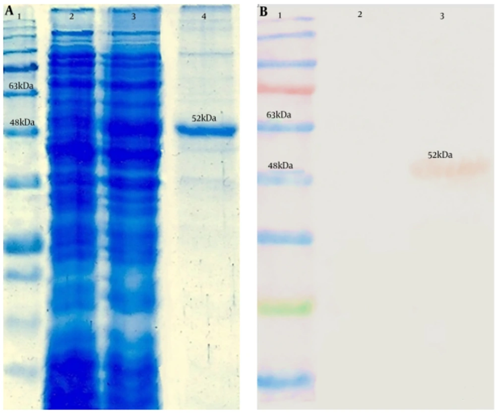Analysis of the 3M2e-HA2-HSP70c chimer protein expression by SDS-PAGE and western blotting assays. A, Lane 1: Protein ladder (Fermentas), lane 2: Expression before IPTG induction, lane 3: Expression after IPTG induction, lane 4: purified chimer protein; B, Lane 1: Protein ladder (Fermentas), Lane 2: negative control, Lane 3: 6xHis-tag-based purified chimer protein.