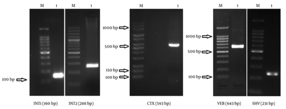The antibiotic susceptibility pattern of A. baumannii, containing ESBL-producing genes and integrons, is shown in Table 3. The coincidence of isolates with different ESBL gene types and class 1 integrons is presented in Table 4. One strain contained 3 ESBL genes (VEB, CTX, and SHV), while 14 strains had 2 ESBL genes (10 strains, CTX and SHV; 4 strains, VEB and SHV). Based on the findings, 14 strains had only 1 ESBL gene (SHV). The coincidence of isolates containing different types of ESBL genes and class 1 integrons was approximately 72% - 100%, which is statistically significant (P > 0.05).