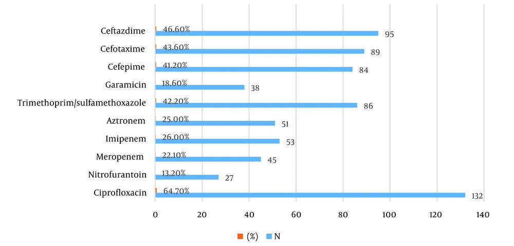 An antibiotic sensitivity test was performed using the disc diffusion method. The antibiotics discs used were imipenem (10 μg), meropenem (10 μg), cefepime (30 μg), ceftriaxone (30 μg), gentamicin (10 μg), aztreonam (30 μg), cefotaxime (30 μg), ceftazidime (30 μg), ciprofloxacin (5 μg), trimethoprim/sulfamethoxazole (25 μg), and nitrofurantoin (300 μg) (Oxoid, United Kingdom). Pure colonies of E. coli were suspended in Muller-Hinton broth, and half McFarland concentrations were prepared. The suspension was then spread on Muller-Hinton agar. Antibiotic discs were placed on the agar, and the plates were incubated at 37°C for 24 hours. The diameter of the inhibition zones around the antibiotic discs was measured, and the results were interpreted as sensitive or resistant according to the guidelines of the Clinical Laboratory Standards Institute (CLSI) (21).