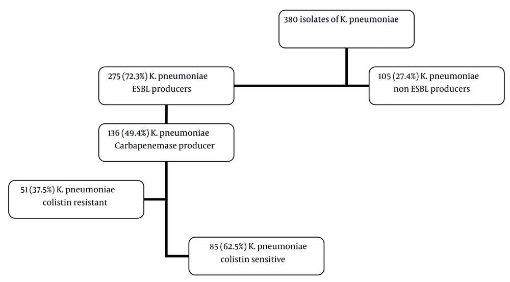 This cross-sectional study was conducted in a referral care hospital with more than 1,000 beds in Tehran, during March 2020 to February 2021. A total of 380 K. pneumoniae isolates were collected from hospitalized patients in different age groups and wards. The biochemical identification of K. pneumoniae isolates were performed by using biochemical tests (8).