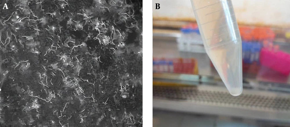 Approximately 1 mL of each urine specimen was inoculated into modified Ellinghausen McCullough Johnson and Harris (EMJH) medium supplemented with 5-fluorouracil, rifampicin, and neomycin (13). The residual urine was subjected to centrifugation at 3500 g for a duration of 15 minutes. The resultant pellet was then utilized for inoculation of modified EMJH medium. The inoculated EMJH media were incubated at 28 to 30°C for a period of 35 days, with observations for Leptospira-like microorganisms conducted weekly using a dark field microscope (13-15). Leptospiral isolates that grew successfully from EMJH medium were transferred to sterile cryovials containing 0.5 mL of culture mixed with an equal volume (1:1) of sterile 20% glycerol solution to protect against freeze damage. Cultures that showed no visible growth after 12 weeks of incubation at 28 - 30°C were considered unsuccessful. The cryovials were subsequently stored at -40°C for long-term preservation.