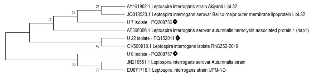 The real-time PCR molecular assay results indicated that 14/118 (11.86%) samples tested positive for the presence of L. interrogans. Table 2 presents the molecular isolation results of Leptospira in the studied samples. All culture-positive and real-time PCR positive samples were positive in conventional PCR targeting the lipL32 gene (Figure 2). The sequencing results of the lipL32 gene were submitted to the GenBank database on the NCBI website and received accession numbers: PQ208756 (U7 isolate), PQ208757 (U8 isolate), and PQ152011 (U22 isolate). Sequence analysis using NCBI BLAST and comparison with GenBank sequences by MEGA software revealed a phylogenetic tree (Figure 3). Comparison of the sequences with other similar sequences showed the similarity of the sequences to GenBank data. Statistical analysis showed that the detection rate of Leptospira was significantly higher in rodent samples than in the other two sources (P < 0.05).