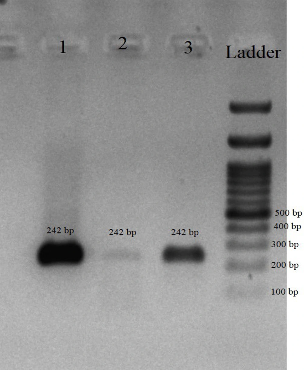 Two sets of primers (real-time PCR primers and a pair designed in the present study for sequencing) were employed to specifically amplify lipL32 genes within L. interrogans. L. interrogans serovar Icterohaemorrhagiae served as the positive control. The 25 μL reaction mixtures comprised 5 μL of 5x PCR buffer, 2.0 mM MgCl2, 0.4 μM of each primer (Table 1), 0.2 mM of dNTP mix, 1.25 U of Taq DNA polymerase (Sinaclon, Iran), and 5 μL of DNA template. The cycling parameters incorporated an initial denaturation at 95°C for 2 minutes, followed by 35 cycles consisting of denaturation at 95°C for 1 minute, primer annealing at 53°C and 55°C for 30 seconds, and extension at 72°C for 1 minute, with an additional extension at 72°C for 5 minutes, concluding with an indefinite holding phase at 4°C. Subsequently, electrophoresis was performed utilizing 1.5% agarose gel in 1x TAE buffer. Three PCR products derived from the positive samples exhibiting the specific bands associated with lipL32 primers were subjected to sequencing analysis (Pishgam Co, Tehran, Iran). The resultant sequencing data were submitted, analyzed, and subsequently compared against the GenBank databases utilizing the basic local alignment search tool (BLAST), which is administered by the National Center for Biotechnology Information (NCBI) (http://www.ncbi.nlm.nih.gov). Furthermore, multiple sequence alignments were conducted employing ClustalW, facilitated by MEGA X software, and the phylogenetic tree was constructed utilizing the Bootstrap method with a total of 1000 replications (17).