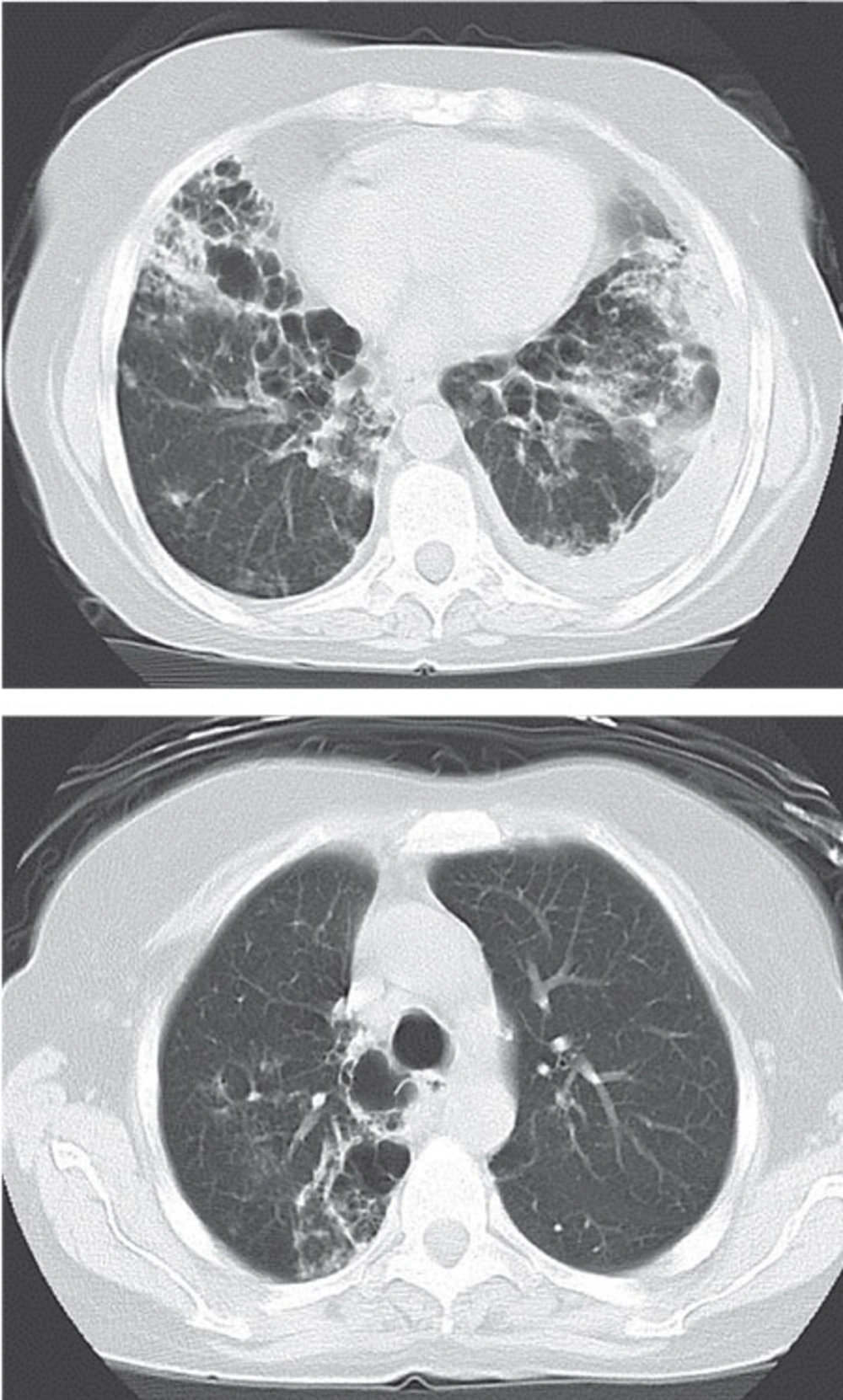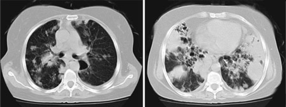 On arrival in emergency room, she appeared severely ill and she was in respiratory distress; respiratory rate 40 breaths/min, heart rate 120 beats/min, temperature 37.6° C, blood pressure 105/80 mm/Hg, and oxygen saturation 93% (with 4 litres of mask oxygen). Facial flushing, oral thrush and musical lung sounds were the remarkable findings. Further investigation revealed leukocytosis (white blood cells: 17 700/mm3), anemia (hemoglobin: 10.3 gr/dL), normal renal and liver function tests, elevated ESR (110 mm/hr), elevated serum lactate dehydrogenase (LDH) (1 190 U/L), and high random blood sugar (336 mg/dL). Mild proteinuria and glycosuria without pyuria, hematuria and casts were reported in the urinalysis. Chest roentgenogram showed multilobar infiltrates and also bronchiectasis, particularly in both of the upper lobes. She was commenced on azithromycin (500 mg loading dose, then 250 mg daily), piperacillin-tazobactam (4.5 gr q6h), bronchodilator, and hydrocortisone (50 mg q3h). Her chest computed tomographic (CT) scan is shown in Figure 1.