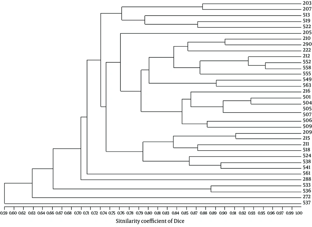 Three classes of ARIs (classes 1, 2, and 3) have been historically involved in multi-drug resistant (MDR) phenotypes and are identified based on their respective integrase genes (5). Various typing methods have been applied to understand transmission patterns of resistance genes and management of nosocomial infections (6). We have previously developed an optimized RAPD-PCR protocol for genotyping K. pneumoniae, comparable to PFGE (7). To understand the associations between phenotypic and genetic characteristics of multi-drug resistant pathogens can be useful for reliable detection of these bacteria in epidemiological studies. Some reports have suggested associations between ESBL production and resistance to several classes of antibiotics, as well as blaESBL with ARI genes carriage in K. pneumoniae (4, 8).