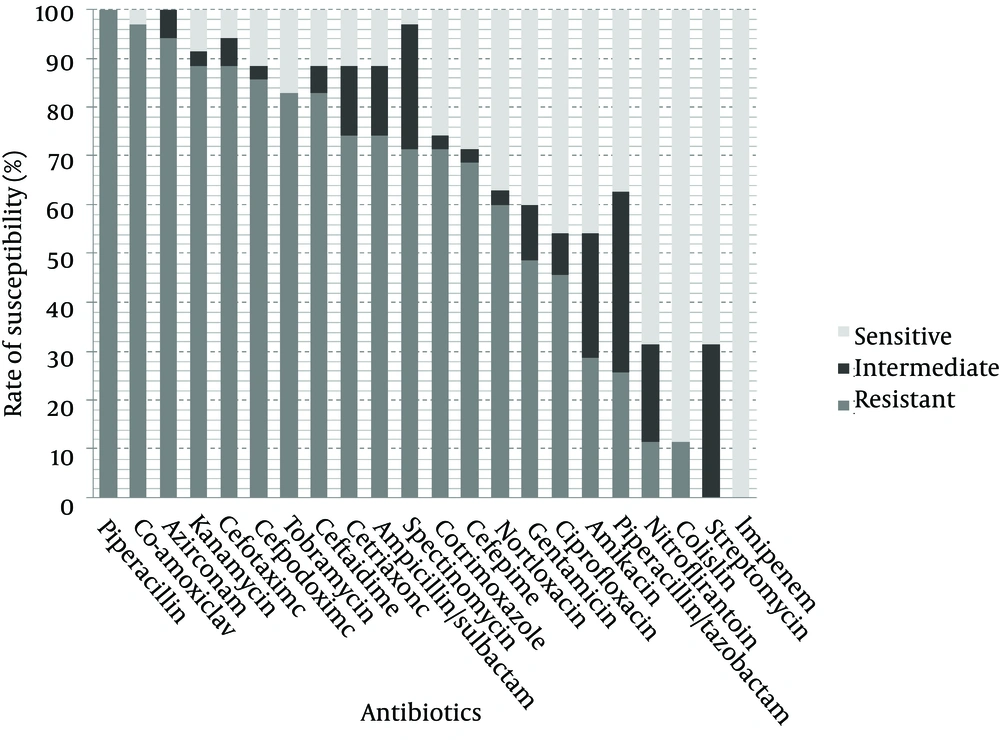 Thirty five ESBL-producing nosocomial isolates of K. pneumoniae were randomly selected from a collection previously described (9). Bacteria were isolated from hospitalized patients at different wards of Labbafinejad teaching hospital, Tehran, Iran, during March 2008 – March 2009; subjects consisted of 23 (65.7%) male patients and 12 (34.3%) females. These isolates were recovered from urine (n = 23; 65.7%), trachea (n = 4; 11.4%), wounds (n = 4; 11.4%), blood (n = 2; 5.7%), sputum (n = 1; 2.9%) and unknown sources (n =1; 2.9%). ESBL production was confirmed using the phenotypic confirmatory test and susceptibility of the isolates to 22 antimicrobial agents (Himedia, India) shown in Figure 1, was determined by the disc diffusion method according to the CLSI criteria (10).