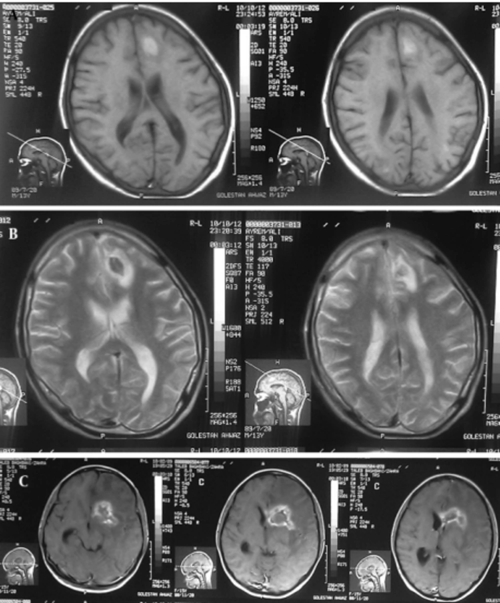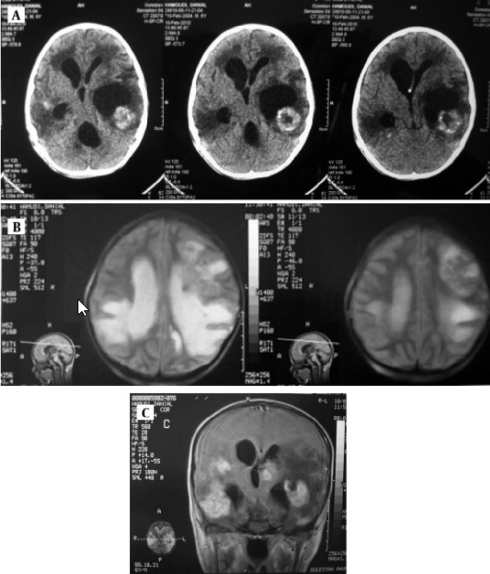 Serological examination for anti- Toxoplasma antibody (Ig M) rate by Chemiluminesans (Roche kit) was more than 9 and Ig G was 6 IU/mL. Brain MRI revealed marked communicating hydrocephaly with corticomedullary junction of both temporal. Hyperdense lesions on T1 with surrounding vasogenic edema and intermediate signal on T2 with bright signal vasogenic edema and on post contrast images multiple enhancing lesions were seen (Figure 3). The patient received pyrimethamin, sulfadiazine and leucovorin. The patient is alive and has neurogic sequel.
